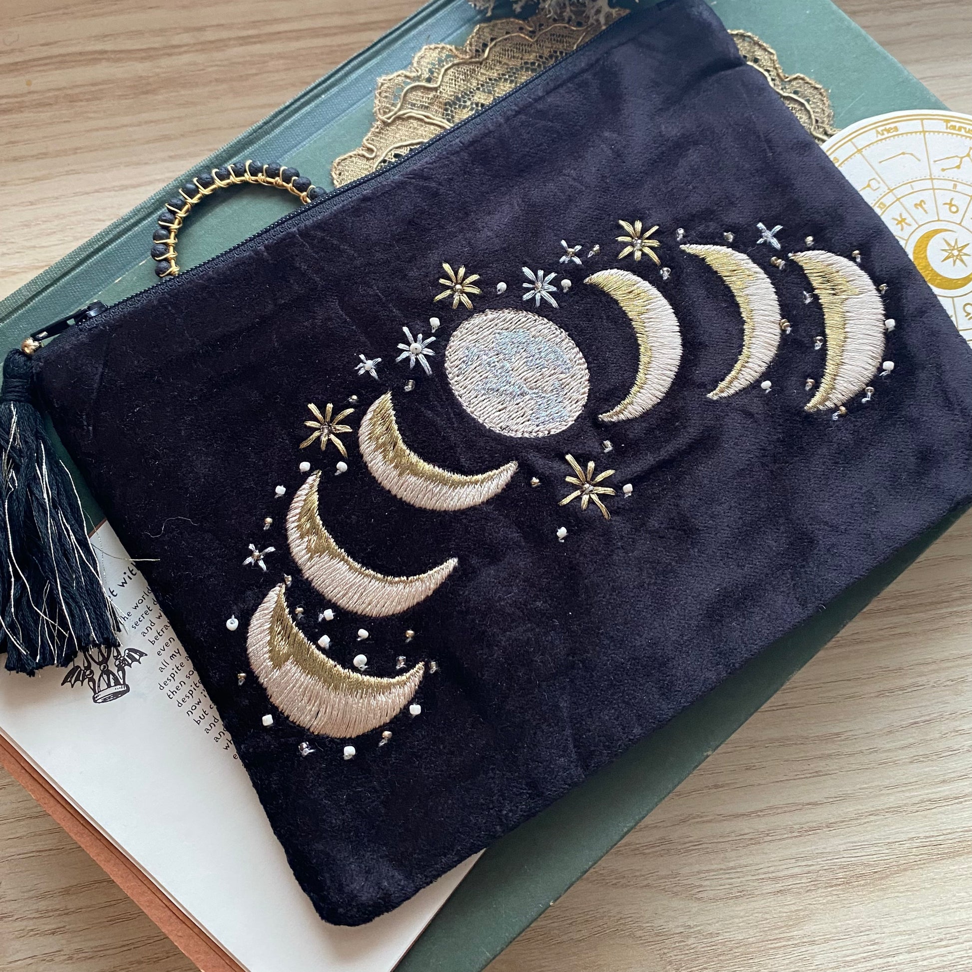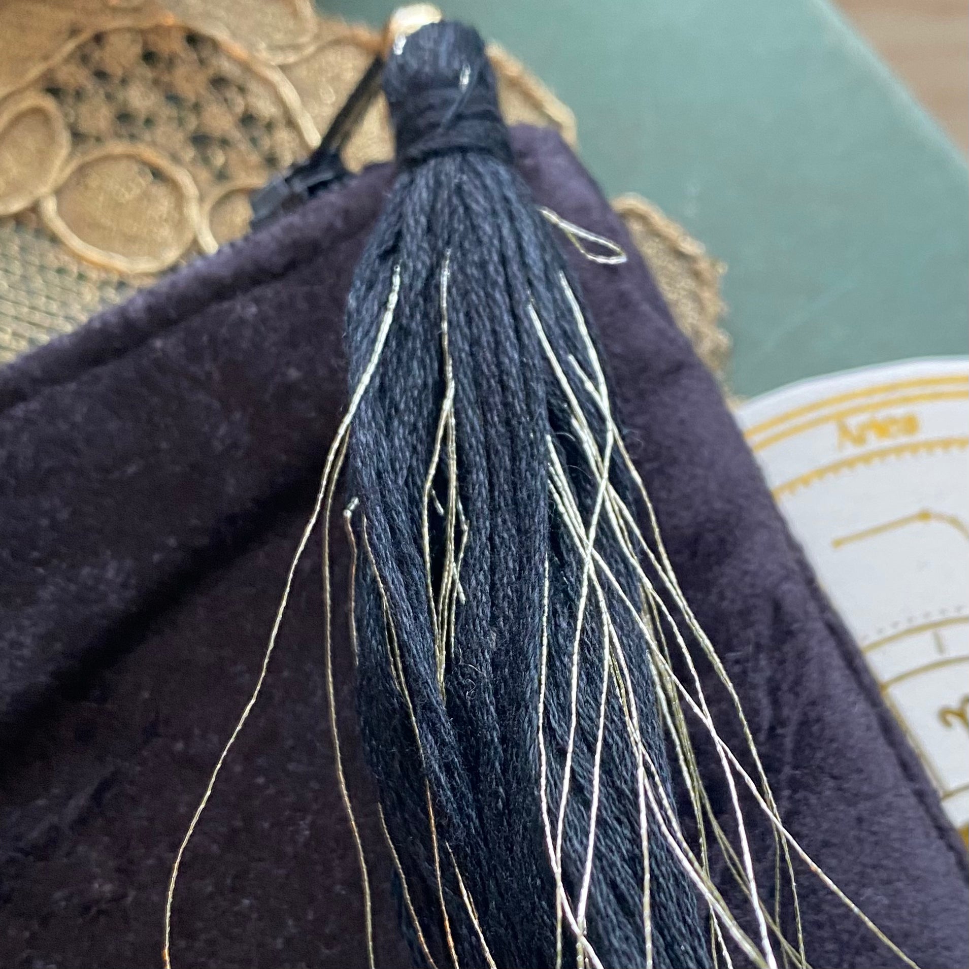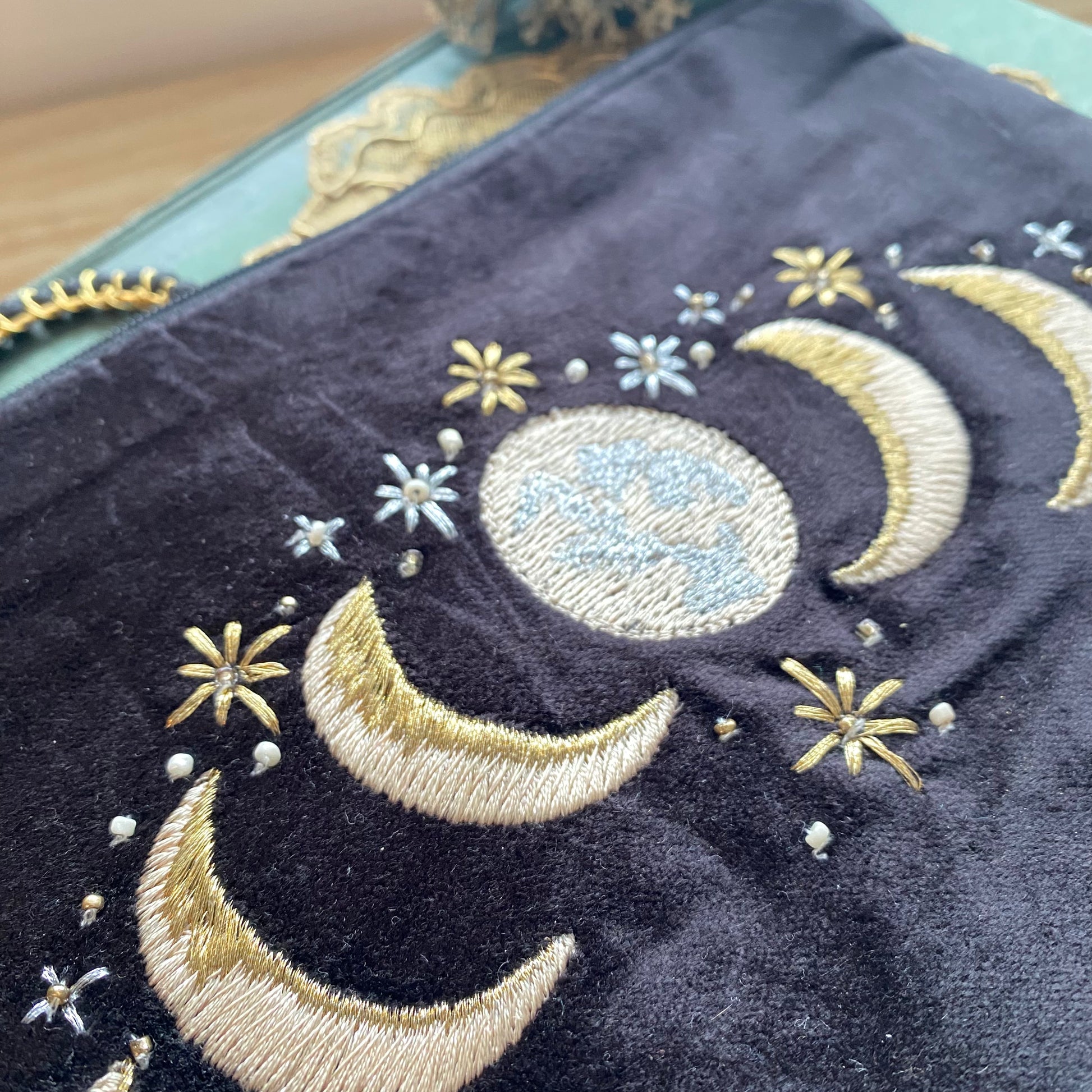 Kulta/beige/hopea kirjailtu musta samettipussukka 20x15 cm musta/kulta tasseli vetoketjussa, alkuperämaa Intia.